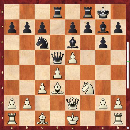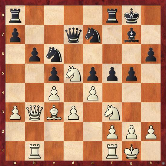 Proveďme úvodem hodnocení pozice. Situace ve středu vyrovnaná, bílý ovládá pole d5, černý e5 a kontroluje d4. Bílý má silný bod d5, slabinou jsou černá pole. Černý má silné pole d4, slabinu v bílých polích. I podle dalších hodnotících kritérií nemá žádná strana výhodu a pozice je v dynamické rovnováze. Rozhodně ještě není zralá pro násilné řešení. Černý měl zahrát 1.-Jg6 s hrozbami f4 i fxe4 a Vxf3. Zvolil plán, který měl vést k neúspěchu. 1.-fxe4 2.dxe4 Vxf3?! 3.gxf3 Jg6 4.Sa1 Jh4 5.Kh1 Dh3 6.Vg1 Jxf3 7.Vg2 Vf8 8.Da4 kombinace s obětí černému mnoho nedala, bílý začíná kontrovat, 8.-Jd4 9.Dxa7?? příliš mnoho optimismu škodí, po 9.Sxd4 exd4 10.Dxa7 d3 11.Je7+Kh7 12.Dxb6 stojí bílý lépe 9.-Je2 10.Dxb6 Jh4 11.Vbg1 Df3! 12.De6+ Kh7 13.Dg4 Jxg1 14.Kxg1 Vb8! 15.Jc3 Dxc3! a bílý se vzdal