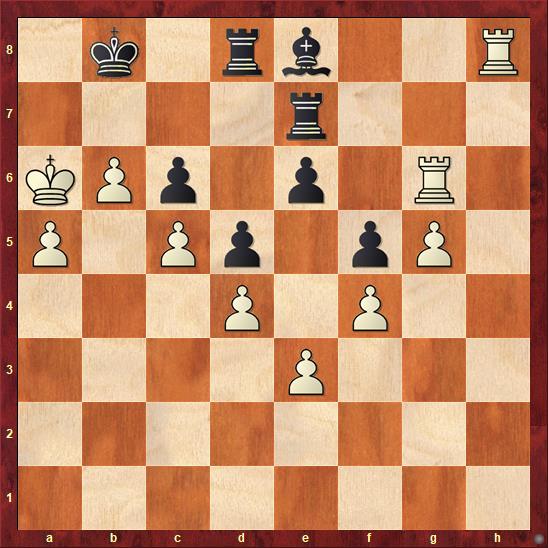 Fantastická pozice, ve které bílý zdvojí věže na osmé řadě, postoupí pěšcem „g“ a ve vhodný okamžik i pěšcem „b“. Černý je však na tahu. 1.-V8d7 2.Vgg8 Va7+ 3.bxa7 Vxa7+ 4.Kb6 Vb7+ a remis věčným šachem. K výhře vedlo 2.Vg7! např. 2.-Kc8 3.b7+! Kb8 4.Vxe7 Vxe7 5.Vxe8+ Vxe8 6.Kb6 a vyhraje