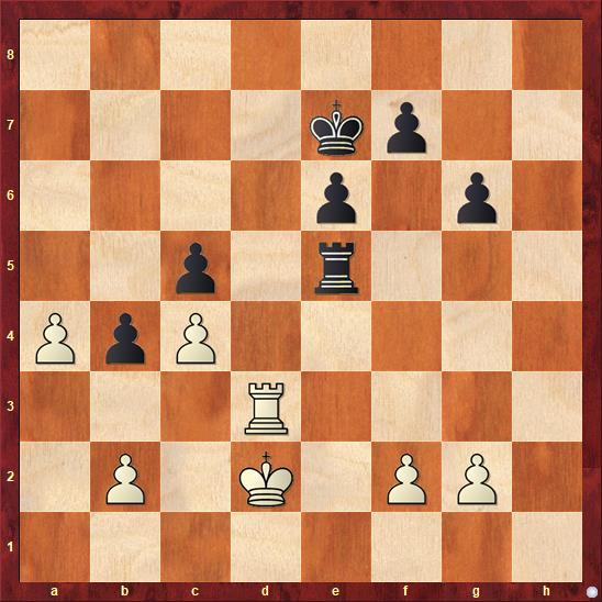 Zajímavá věžová koncovka. Materiálně jsou síly vyrovnány, bílý má volného pěšce „a“. Černý král je odříznut od dámského křídla a černá věž musí spěchat k zadržení volného pěšce. 1.g4! Ve4 2.a5 Vxg4 3.a6 Vh4 4.Vd8! Kxd8 5.a7 (nebo 3.-Vg1 4.a7 Va1 5.Va3 bxa3 6.a8D axb2 7.Db7+ a vyhraje).