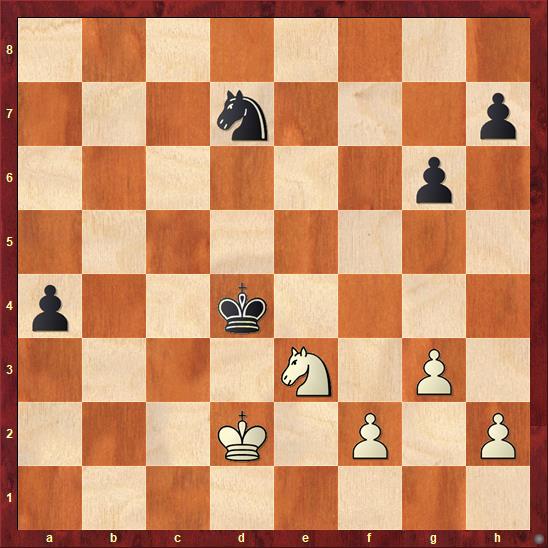 1.-Je5 (s hrozbou 1.-Jc4+) 2.Kc2 Jd3 3.Jd1 Je1+ 4.Kb2 (na 4.Kd2 a3) 4.-Jf3 5.h4 Je5 6.Ka3 Ke4 7.h5 (protože 7.Kxa4 vázne na Kf3 8.Kb5 Jg4 a 9.-Jxf2, pokouší se bílý znehodnotit černé pěšce) 7.-gxh5 8.Jc3+ Kf3 9.Jd5 Jg4 10.Je7 Jxf2 11.Jf5 Je4 12.Kxa4 Jxg3 13.Jh4+ Ke4 14.Kb4 Jf5+ a bílý se vzdal